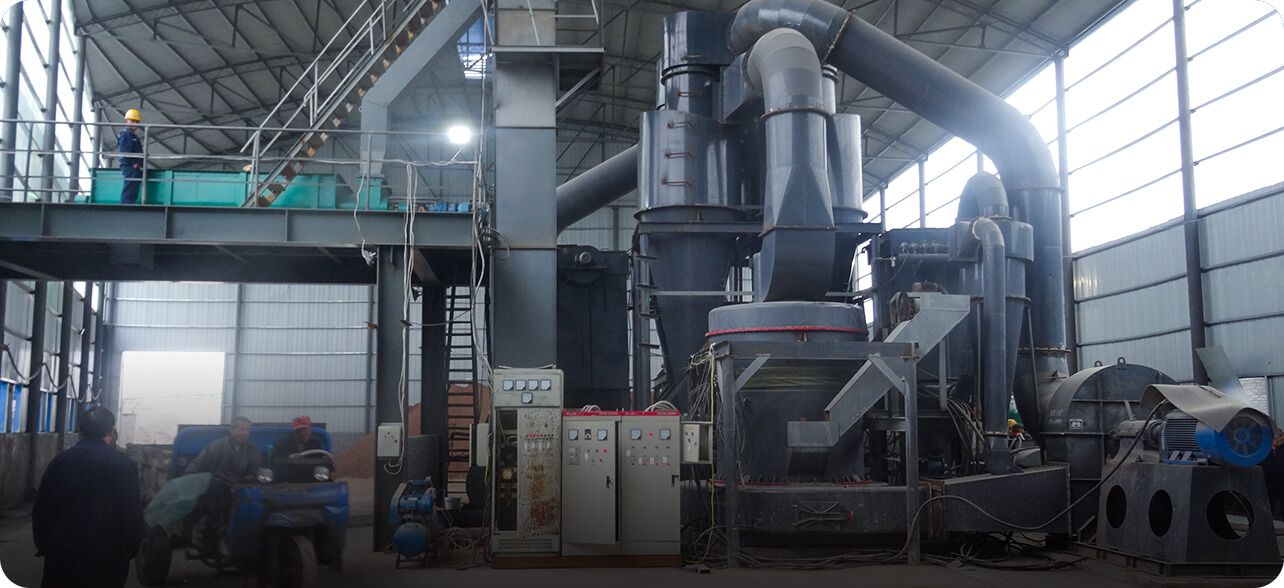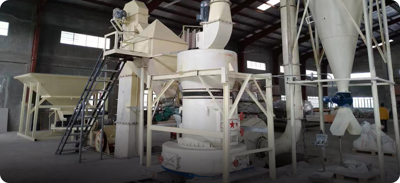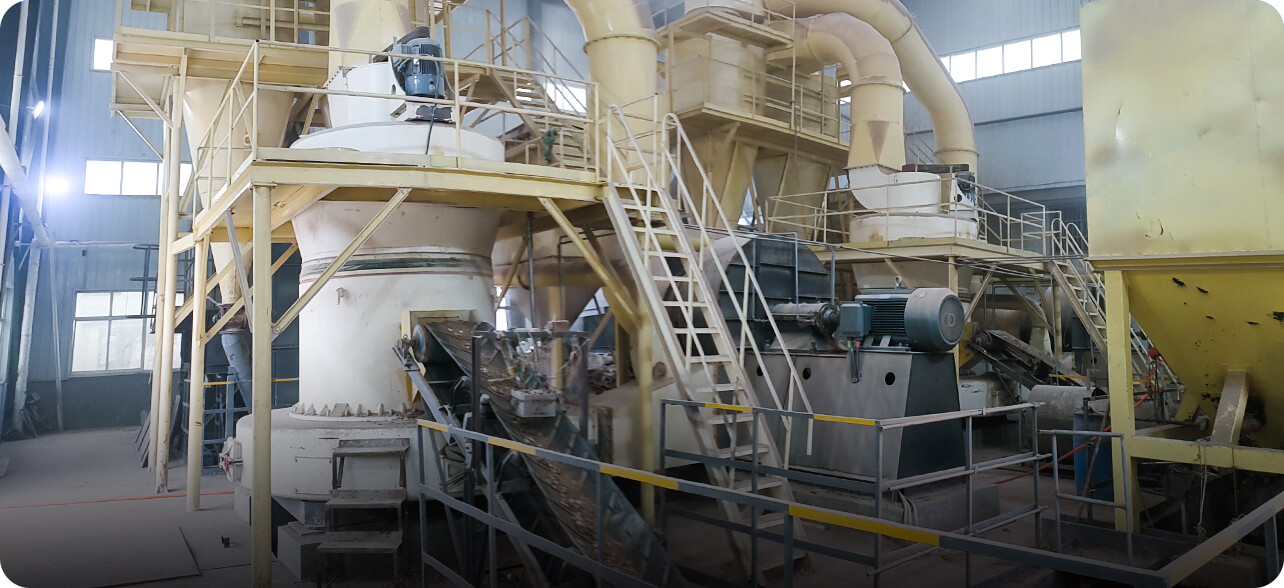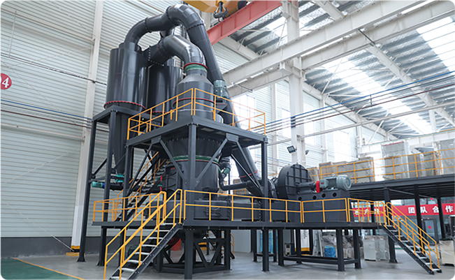 大塊物料進(jìn)入顎式破碎機(jī)后進(jìn)行初級(jí)破碎,然后由斗式提升機(jī)將合適粒度的物料均勻送至儲(chǔ)料倉(cāng)。通過電磁振動(dòng)給料機(jī)把儲(chǔ)料倉(cāng)的物料均勻、定量、連續(xù)地送到磨粉機(jī)的研磨室內(nèi)進(jìn)行研磨。研磨后的粉末在鼓風(fēng)機(jī)的作用下吹向選粉機(jī)進(jìn)行分選,合格細(xì)粉則由管道送至儲(chǔ)料倉(cāng),分選后的不合格粉料回落繼續(xù)研磨,最后經(jīng)出料閥輸出即為成品粉料。篩分后合格的成品細(xì)粉隨管道裝置進(jìn)入收塵器內(nèi)分離收集,并統(tǒng)一用裝粉罐車打包或送入成品料倉(cāng)內(nèi)即可。