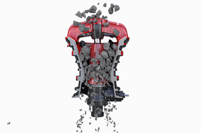 利用破碎錐在殼體錐腔內(nèi)的旋轉(zhuǎn)運(yùn)動來擠壓、劈裂和彎曲物料,對各種硬度的礦石或巖石進(jìn)行粗碎。裝有破碎錐的主軸上端支撐在橫梁中部的襯套內(nèi),下端置于軸套的偏心孔內(nèi)。當(dāng)軸套旋轉(zhuǎn)時,破碎錐繞機(jī)器中心線偏心運(yùn)動。它的破碎動作是連續(xù)的,所以它的工作效率比顎式破碎機(jī)高。