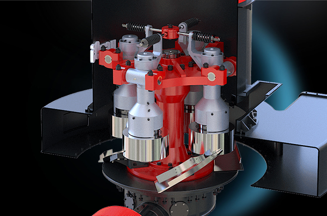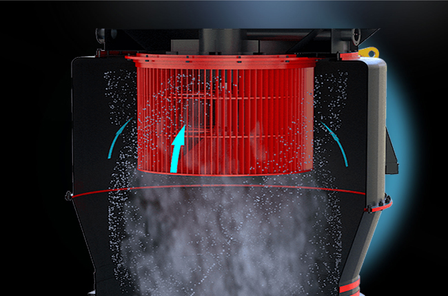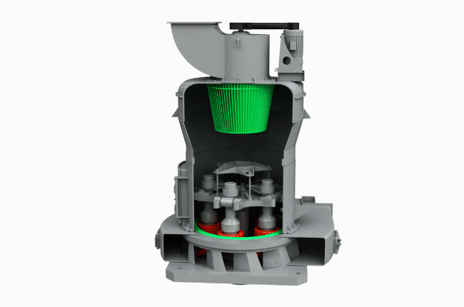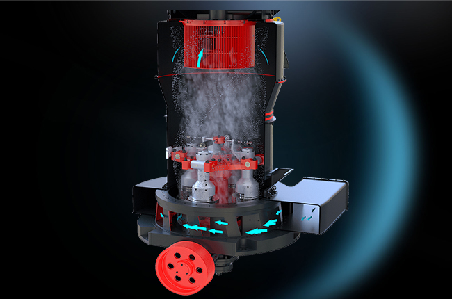 該機結(jié)構(gòu)主要由主機、分析器、風(fēng)機、成品旋風(fēng)分離器、微粉旋風(fēng)分離器及風(fēng)管組成。其中,主機由機架、進風(fēng)蝸殼、鏟刀、磨輥、磨環(huán)、罩殼組成。雷蒙機工作時,將需要粉碎的物料從機罩殼側(cè)面的進料斗加入機內(nèi),依靠懸掛在主機梅花架上的磨輥裝置,繞著垂直軸線公轉(zhuǎn),同時本身自轉(zhuǎn),由于旋轉(zhuǎn)時離心力的作用,磨輥向外擺動,緊壓于磨環(huán),使鏟刀鏟起物料送到磨輥與磨環(huán)之間,因磨輥的滾動碾壓而達到粉碎物料的目的。