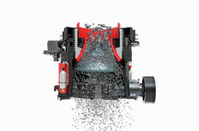 在工作時通過電動機(jī)的旋轉(zhuǎn)帶動帶輪或聯(lián)軸器、傳動軸和圓錐部在軸心線下使偏心軸做周期性旋擺運(yùn)動。在物料從料口進(jìn)入破碎腔后因受到偏心軸和軋臼壁的相互沖擊擠壓、研磨、揉搓從而產(chǎn)生破碎的作用。液壓保險(xiǎn)系統(tǒng)能在機(jī)器發(fā)生過鐵故障或者悶車現(xiàn)象時通過液壓將支撐套和定錐部排除出故障物,在起到很好的保險(xiǎn)作用的同時大大的降低了維修率及提高生產(chǎn)效率。