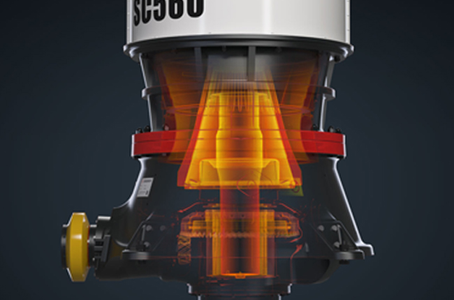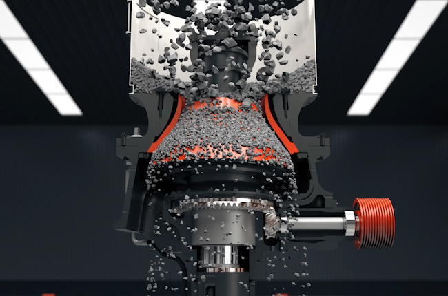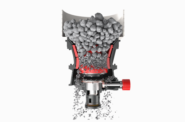 單缸圓錐破碎機工作時,電機帶動破碎機的小齒輪,小齒輪帶動大齒輪,大齒輪組件帶動偏心套組件和主軸組件以理論垂直線為中心,在銅襯套內(nèi)公轉(zhuǎn),主軸組件在偏心銅套內(nèi)以主軸的中心線可以實現(xiàn)自轉(zhuǎn)。當(dāng)物料加入到破碎腔后,主軸總成在物料的阻力下在偏心銅套內(nèi)緩慢的自轉(zhuǎn)。內(nèi)錐的運行軌跡看起來是在破碎腔內(nèi)來回擺動,同時緩慢的旋轉(zhuǎn)。物料被擺動的內(nèi)錐擠壓破碎,破碎出的物料從而排料口排出。